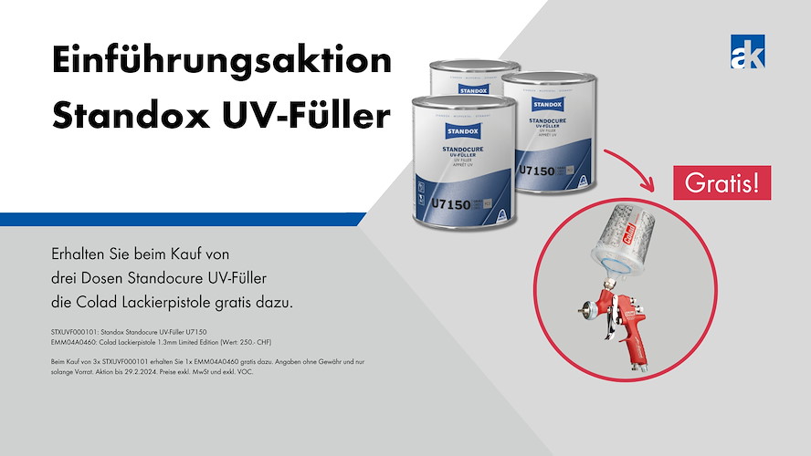 Beim Kauf von drei Dosen Standox Standocure UV-Füller erhalten Sie die Colad Pistole gratis dazu. Angaben ohne Gewähr und nur solange Vorrat. Preise exkl. MwSt und eckl. VOC.