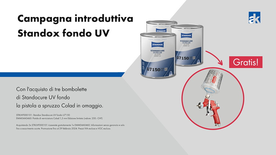Acquistando tre barattoli di stucco UV Standox Standocure, riceverete gratuitamente la pistola Colad. Informazioni senza garanzia e solo fino a esaurimento scorte. Prezzi IVA e VOC esclusi. VOC.
